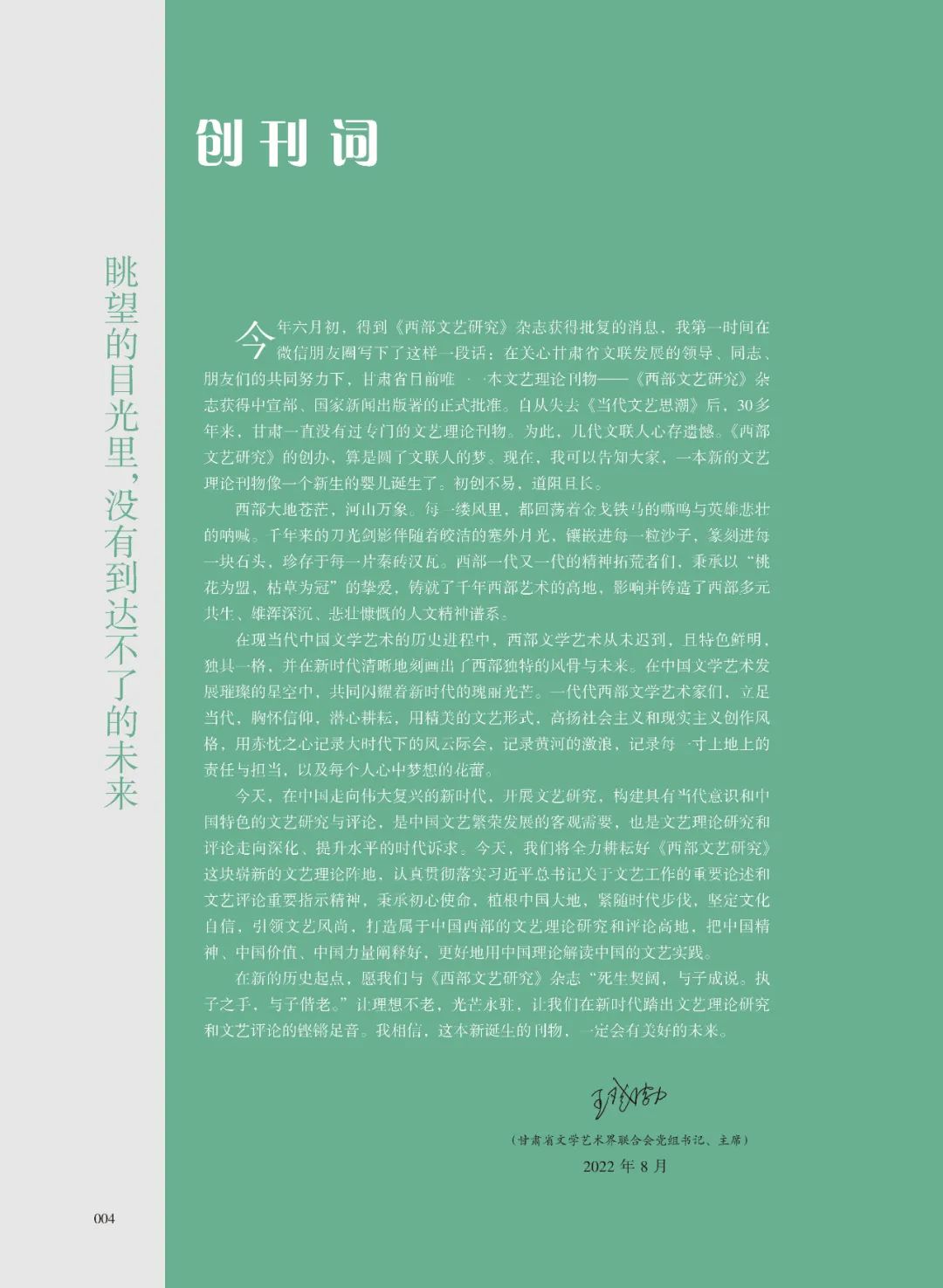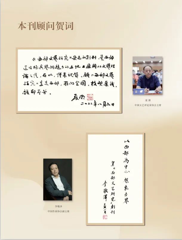 在新的历史起点,愿我们与《西部文艺研究》杂志“死生契阔,与子成说。执子之手,与子偕老。”让理想不老,光芒永驻,让我们在新时代踏出文艺理论研究和文艺评论的铿锵足音。我相信,这本新诞生的刊物,一定会有美好的未来。(甘肃省文学艺术界联合会党组书记、主席 王登渤 2022年8月)