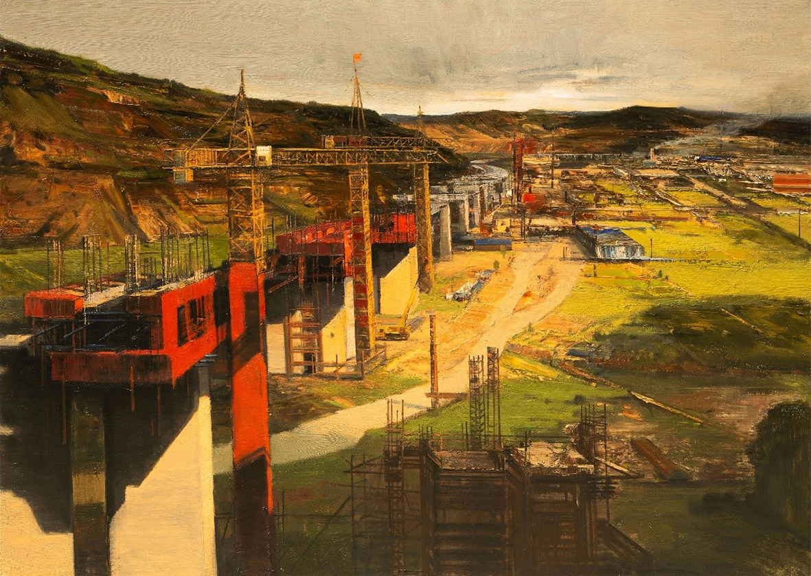 布面油画《筑梦陇塬》以陇漳高速建设场景为题材,将西部塬上的壮阔山河为背景,通篇采用暖色调,画面中厚重的黄土高塬与橄榄调的夏日沃野,被气势宏伟的高速桥墩和红色塔吊形成的纵横透视打破平衡,结构出深远辽阔的建设场面,杂乱的工地被巧妙的统一在阳光与阴影的节奏处理中,乱中见整,抽象笔触与具象表现有机统一,描绘出陇塬大地在新时代的建设大潮中,展现出来的磅礴豪情和发展速度。
