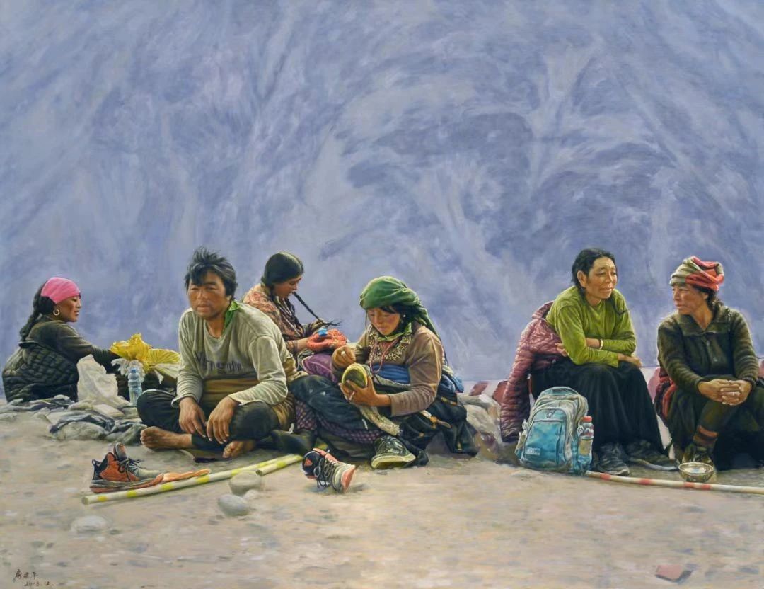 甘肃省文艺创作传播中心副主任、《西部文艺研究》杂志执行主编 、省美协理论委副主任兼秘书长王安民:从黎明出发,翻越了雪山,匍匐过草地。此刻,正午的阳光灿然而来,打在他们古铜般的脸上,该停下来歇会了。一个男人带着五个女人去朝圣,这一路,不知道走了多少天,转了多少山,磕了多少长头。此刻,他们正安静的坐在路边休息。作为金驼奖金奖作品,房建平先生的《朝圣》正是用现实主义的写实风格,细致刻画了他们瞬间的状态——男人脱下鞋透透气,女人有的在缝补、有的打个盹、有的扎着辫子、有的送出一个安慰的眼神。房建平的油画,一直坚守现实主义的创作原则,着力表现当代生活,以细节为基础,以自然为范本,忠于客观对象的表现,将朴素之美凝聚于笔端,拒绝太多的人工修饰和审美想象。《朝圣》中的人物自然、朴素、安详、健康,画面中人物位置、山川布局、结构比例、形色等达到了和谐、统一和平衡,更好地表现了天人合一、心怀信仰、敬畏天地的朝圣理念。房建平对西部有着独特的情怀,怀着对西部的大爱,多年来通过手中的笔记录西部、描绘西部、感悟西部,创作了大量关于西部民族风情的作品,展现了其独特的艺术魅力和当代艺术价值。