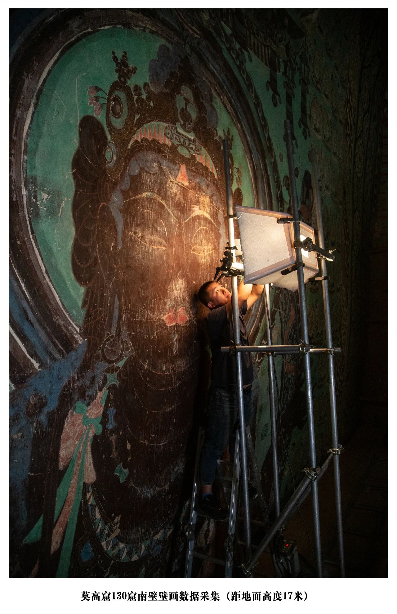 本组照片用镜头记录莫高窟第130洞窟数字化的过程,包括从一层到四层逐层升高的过程,并且从壁画数据采集现场、三维模型采集、数据处理与加工等方面进行影像记录。
